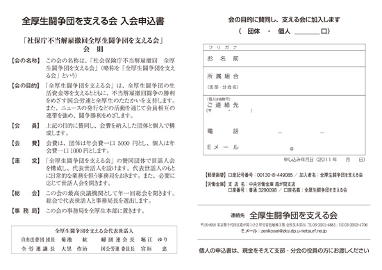 たたかいに勝利するカギは、39人の生活を支え、運動を広げることです。そのためにも、全厚生闘争団を支える会への団体と個人の加入の拡大が決定的に重要です。