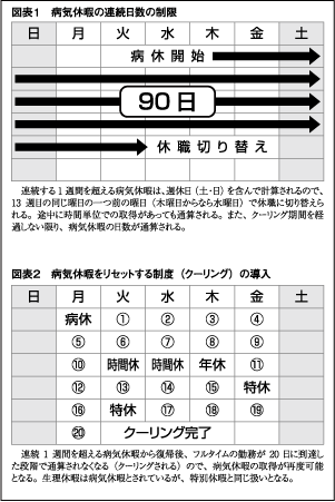 ただし、フルタイムの勤務を20日間行えば、通算がリセットされ、あらためて病気休暇を取得することができます(これをクーリングとよびます。図表1、2を参照)。