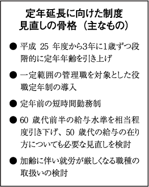 人事院は、公的年金の支給開始年齢の引き上げに合わせて、2013年度から定年年齢を段階的に65歳まで延長することが適当であるとして、「公務における高齢期雇用の基本的な方向と定年延長に向けた制度見直しの骨格」を提示しました。