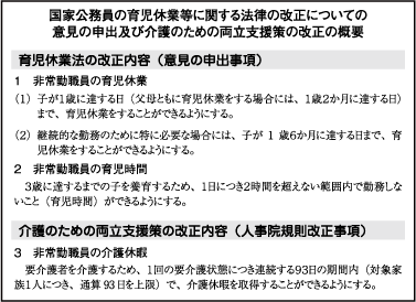 これをふまえ、非常勤職員が育児休業等をすることができるよう「国家公務員の育児休業等に関する法律」の改正についての「意見の申出」を国会と内閣に行いました。併せて、介護休暇制度の導入についての人事院規則の改正も行うとしています。