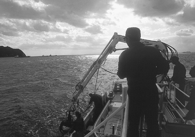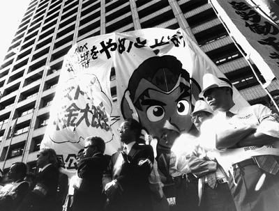 「ストップ!年金大改悪」のイメージキャラクター「年金ボーイ」が書かれた横断幕を持つ国公労働者(全労連年金改悪阻止厚生省前行動)