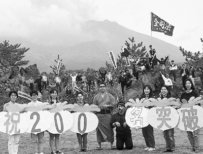 薩摩のヒーロー「西郷どん」と「お供の犬」、左右を囲む「桜島ダイコン娘」、背後に元気な青年組合員たち。全司法鹿児島支部「祝200名突破」の記念集合写真=1993年11月20日、鹿児島県・桜島