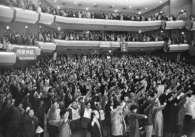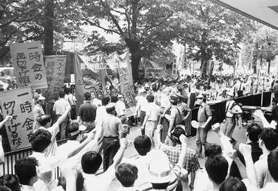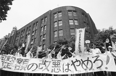 この日、全司法鹿児島支部の仲間は国公労新聞94年新年号取材のため集まってくれた。組合員200名突破は支部の悲願だった。1964年、鹿児島地家裁所長に、狂信的な右翼思想裁判官の飯盛重任(いいもりしげとう)氏が着任。彼は全司法を反体制集団と決めつけ、卑劣な組合弾圧をおこなった。250人いた組合員が70年には約40人になった。全司法は不当労働行為とたたかう鹿児島支部を全国的に支援した。こうしたなか、70年に飯盛氏は、鹿児島地家裁の裁判官に青年法律家協会加入の有無、天皇制是非などの思想調査目的の公開質問状を出した。このことが社会的にも問題化し、最高裁は飯盛氏を所長解任した。その後、支部は青年を中心に組織を拡大し、93年5月に200名を突破した。