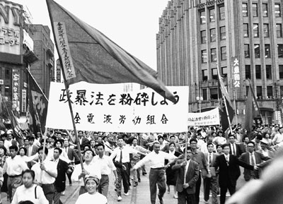政暴法粉砕のフランスデモ(道路いっぱいに広がるデモ行進の形態)をする全電波労働組合(現・全通信労働組合)の隊列=1961年6月、東京・銀座の数寄屋橋交差点