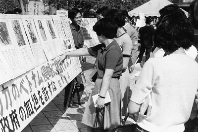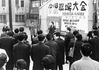 賃金要求と総定員法粉砕を掲げて実施された全厚生本省支部と人口研支部の12・18早朝職場集会=1968年12月18日、東京・霞が関の厚生省中庭