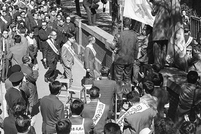 1968年8月、人事院は平均8.0%、3973円引き上げの勧告を行った。政府は8月30日、「総合予算主義(当初予算に計上した範囲で支出する)」をたてに前年同様の8月実施と、3年間5%の第1次定員削減計画を閣議決定した。国公共闘は、勧告後の組合員の要求を集約するため、初めてアンケートによる要求の再組織化にとりくみ、@実施時期5月、最低引き上げ3500円などの統一要求の実現、A定員削減反対、などの課題でたたかうことを確認した。公務員共闘は10月に早朝1時間ストを実施後、12月18に第2波ストを構えた。自民党にはスト回避と総定員法成立の思惑があった。12月14日、自民、社会、公明、民社の国対委員長会議で、勧告実施時期を7月とすることを決め、総定員法は「誠意をもって審議をする」との4党申し合わせを行った(「国公労新聞」69.1.15付)。公務員共闘は12・18統一ストを中止したが、国公共闘は18日に予定通り全国早朝職場集会を実施した。総定員法は翌69年5月に成立したが、国公共闘は総定員法粉砕のため5ヵ月半を全力でたたかい抜いた。