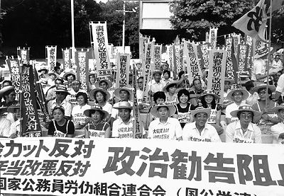 その後、76年人事院勧告をめぐって、政府のなかに低額勧告をださせる動きが強まったので、国公労連はスト体制を確立してたたかった。しかし、人事院は8月、水準では春闘相場なみだが、6月と12月の期末手当をそれぞれ0.1ヵ月ずつカットする勧告を行った。