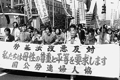 こうした動きにたいし、女性労働者は、国連の女性差別撤廃条約にもとづく男女雇用平等と母性保護切り捨ての労働基準法改悪に反対してたたかった。そして、実効ある男女平等法の制定めざす立法化の運動とともに、職場から女性差別をなくしていくためねばり強くたたかっていった。