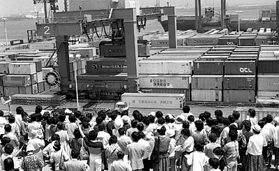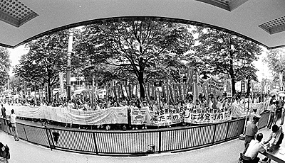 2000人が参加した国公労連、東京国公の人事院包囲行動。この日全国の国公職場で一時金の差別支給に反対する早朝時間外集会が実施された=1990年7月3日、東京・霞が関