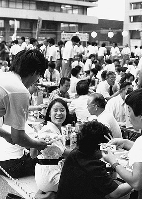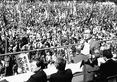 国公労連青年協は、5月24日から3日間、’90国公青年大交流集会(エキサイティング信州)を開き、参加した2539人全員が各県ごとに一時金差別支給反対のよせ書きを布に書いた。それをぬいあわせた40メートルのジャンボ横断幕を作成し、それをもって何度も人事院本院を包囲する怒りの反対行動を実施した。