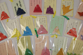 (写真=休み時間に、ひな祭りの折り紙を一つひとつ折り、思いを込めたメッセージを書いた「一言しおり」をつくる参加者たち)