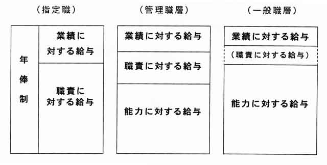 1) 職員一人一人を多様な側面から評価し、総合的な貢献度を適切に反映した給与を実現するとともに、組織ニーズに応じた機動的・弾力的な人事配置を推進するため、現行の職務給原則を改め、給与体系を「能力に対する給与」「職責に対する給与」「業績に対する給与」に分割し、それらを指定職(審議官以上)、管理職層(本府省においては企画官以上、地方支分部局においては課長以上)、一般職層(課長補佐以下)ごとに適切な比率で組み合わせたものとする。