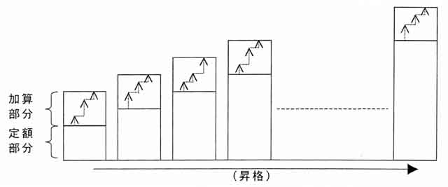 3) 「加算部分」は、毎年の評価に基づいて年1回加算(昇給)を行う(評価区分に応じた加算額テ一ブルを設定)。なお、評価が不良な場合は、加算を行わない。