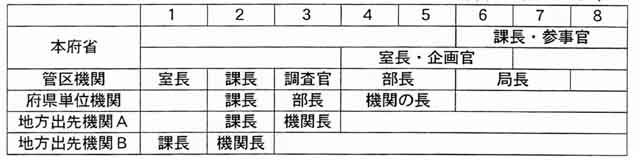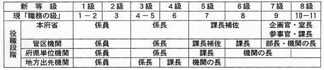 2) 現実の行政組織においては職員の能力が役職段階(課長、課長補佐、係長等)に応じて認識されていることから、具体的な能力の定義に当たっては一定の役職段階を想起させるものである必要がある。従って能力等級の体系は、組織区分(本省、地方支分部局等)ごとに標準的な役職段階との相関関係を持たせたものとする。