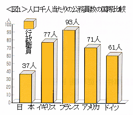 「公務員が多い。だから行政改革でスリムに」これまでの行政改革で、繰り返し主張された点です。しかし現実はどうでしょうか。政府の資科でも明らかなように、行政改革が進んだと言われる英米に比べても、日本の公務員の数は半分でしかありません。しかも、国家公務員だけをとってみても、1982年からの15年間で、43,169人も純滅になっています。増大する行政需要のもとでの定員削滅の影響の深刻さを、全法務労働組合が告発しています(後掲の省庁別ページを参照)。
