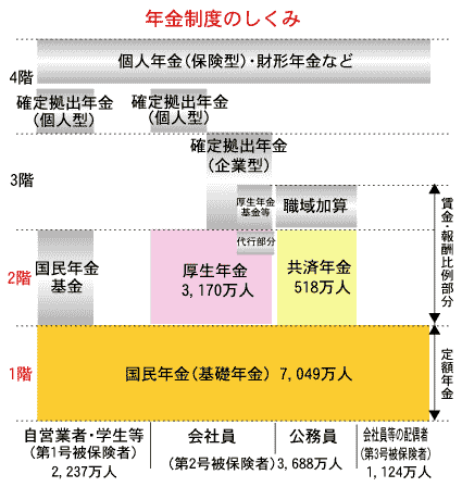 国民年金は、基礎年金という1階部分だけです。厚生年金は1階の基礎年金と2階の報酬比例部分を合わせた2階建てとなっています。その上に、企業が独自に実施する厚生年金基金などの企業年金が3階部分として乗ります。
