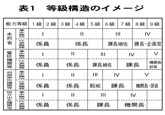 その基本にあるのが能力等級制度です。本省であれば課長、係長などの基本職位を4段階に整理し、それを1級〜9級までの能力等級に分類整理するというものです。(表1参照)