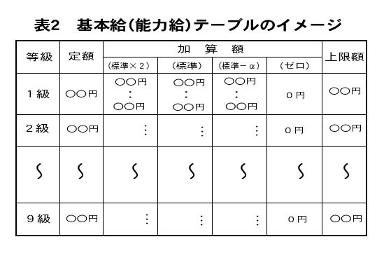 新給与制度での基本給とされる「能力給」は、「能力等級」(表@)をもとに、各等級毎の定額部分と、「職務遂行能力の向上」に対応した加算額部分の合算で決定されます。加算額(現行の昇給に対応)は、業績評価を「重要な参考資料」に、「ゼロから標準の2倍」の間の「4段階」で選別支給し、人件費抑制の観点から級ごとに、累積額の「上限額」を設けるとしています(表2参照)。
