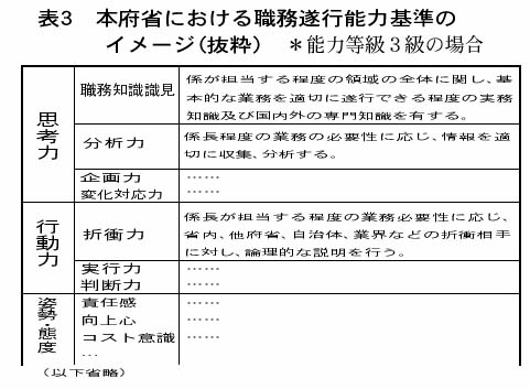 「能力評価」のため各省は「思考力」「行動力」「姿勢・態度」などの能力要素ごとに「職務遂行能力基準」(表3参照)を定めなければなりません。この「職務遂行能力」のイメージによれば、「解決すべき問題点を的確に把握する」「解決の方向性を的確に洞察する」(思考力の項目)など抽象的・一般的な基準ばかりで、上位等級への昇任基準や分限処分の基準として使えるとは到底いえません。しかも、「責任感」「向上心」(姿勢・態度の項目)など、評価者の主観で判断される基準が当然のように残されています。