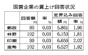 郵政事業などの各国営企業当局は、国営企業各組合に対して、2001年春闘要求に対する有額回答を行っています。回答額、率は表のように、のきなみ超低額の回答となっており、とりわけ郵政産業労働組合(郵産労)には、90円というベアゼロにも等しい回答が示されました。