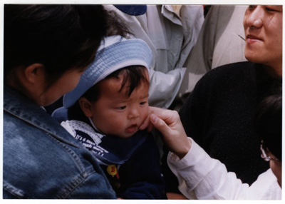 [評] 保育士さんたちが散歩か、参加者としてか、乳母車を並べて子どもたちを連れて来たようです。面白いのは子どもたちが「おじさん、おばさんたち大勢集まって何してるんだろう」と興味深い様子で伺っている様子です。背景の建物など余計なものを切り詰めて、子どもたちと保育士さんにより絞って撮ると、主題が明確になってきます。