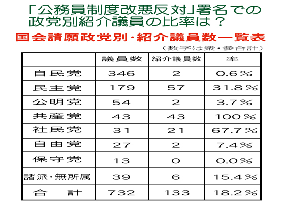 20万筆近い署名の集約や、300万枚におよぶ大量ビラ宣伝にとりくんだことなど、これまでの運動をさらに発展させ、国民に開かれた行政と公務員制度の確立にむけ、国民的なたたかいを発展させ、一方的な改悪を阻止しましょう。