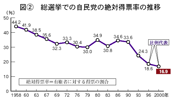 すでに、構造改革がすすむにつれ、自民党は選挙のたびことに得票を減らし(図2)、小泉首相をかつぎ出した自民党の足元はグラグラです。