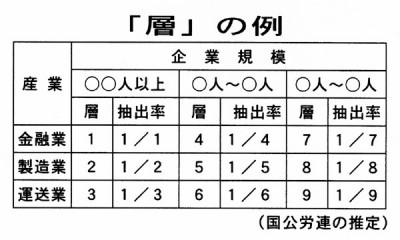 今回示された見直し案は、調査方法の変更ではなく、調査企業を抽出する際に、人事委員会ごとに異なる「層」の作り方を、時代の変化に合わせ、小規模事業所への調査率を高めようとするものです(下表参照)。不況が深刻化するなかで高まっている「公務員給与は恵まれている」論に引きずられての見直しであることははっきりしています。見直しは、「官民較差」に影響するだけでなく、やがて配分の見直しを通じて、地方の公務員賃金引き下げにもつながりかねません。