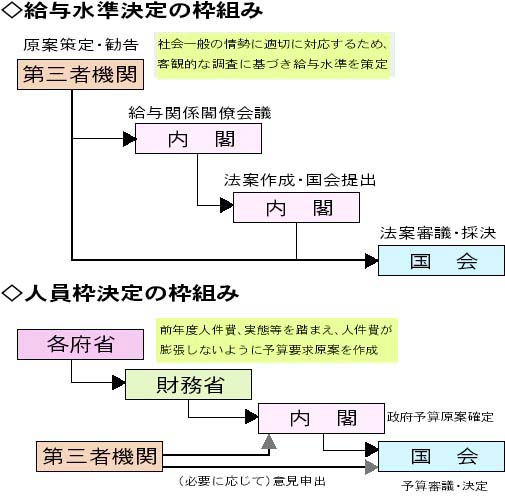一つには、先にもふれている新人事制度での「労働条件決定システム」が検討されていないからです。「大綱」では、人事院は「給与水準等を決定し国会及び内閣に勧告」、「あらかじめ定められた明確な基準に基づき、等級毎の人員枠(級別定数)について、国会及び内閣に意見の申し出」することが「代表例」として記載されています(図1)。