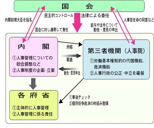 その中心は、内閣が人事行政の企画・立案を行うことを明確に位置づけたことです。「大綱」では、各府省(人事管理権者)が行う人事管理の「ルール」を定める企画・立案機能は、原則として内閣が担うこととし、その上で、勤務条件についての人事院の「適切な関与」を「代償措置」として検討しようとしています。