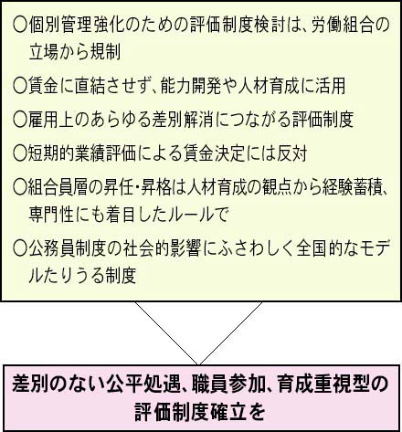 「短期評価の賃金反映を認めない」ことを前提に、政府・各省当局の一方的な評価システムの制度化を許さないためにも、「素案」の討議をふかめ、「試行」への対応を、単組段階でも準備する必要が生まれています。