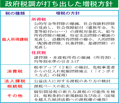 中期答申は昨年6月の基本方針(あるべき税制の構築に向けた基本方針)で示された「大衆課税強化」のうち、「少子・高齢社会を支える税制などの課題」について、中低所得階層をターゲットにした増税方針を打ち出しています。