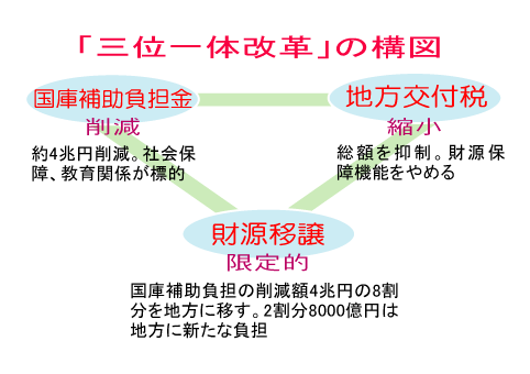 第3に、押しつけの市町村合併や「三位一体改革」(図2)など、地方自治を破壊し地方の切り捨てとなる「分権」策動に反対する全労連規模の運動への結集を強めます。