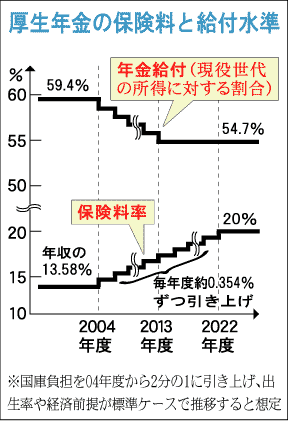 今回の厚労省案は、(1)厚生年金の保険料(現在は年収の13・58%、労使折半)を04年度から毎年0・354%ずつ引き上げ、2022年度に年収の20%までアップして「固定」する、(2)厚生年金給付の平均年収比(40年加入の夫婦のモデル年金)は現行の59・4%から、10年かけて54・7%程度に引き下げる(下図)としています(下表・厚労省案のポイント)。