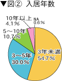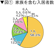 | ●公務員宿舎の負担に関するアンケート結果 宿舎に不満44%、退去時負担「高い」27% 公務員宿舎に居住する国家公務員にとって、退去時の過大な負担が強い不満となっているなか、財務省は昨年7月、国家公務員宿舎の原状復帰についての基準的考え方を29年ぶりに改正しました。その内容は、入居者の負担となる補修については、全国的統一性を考慮して必要最小限のものとする観点から、障子や畳の張り替えは原則1枚・1組単位とするなど、これまでよりやや具体的に規定しています。 これは、私たちの要求を一定反映しています。しかし、問題は、管理人への趣旨の徹底を含めて、それが基準どおり実効されているのか、また、現実に職員の不満を解消することにつながっているのかです。 国公労連は、合同宿舎を中心に、今年4月の退去者を対象にアンケート調査を実施しました。 アンケート回答者は、合同宿舎の入居者691人。家族を含む入居者数(図1参照)は、1人が58%と単身世帯が半数を超え、2人世帯は12%、3人以上世帯は29%です。入居年数(図2参照)は3年未満が55%と半数を超えています。
