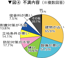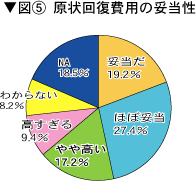 退去直前まで入居していた宿舎についての満足度(図3参照)については、満足派(「満足」と「ほぼ満足」)が52%、不満派(「やや不満」と「大変不満」)が44%と、満足派が不満派をやや上回っています。しかし、不満派が44%というのは決して少ない数字とは言えません。 ![]() 「不満」の具体的内容(図4参照※複数回答)については、建物が古い66%、設備が悪い52%、狭い26%がワースト3となっています。昭和40年代に建設された合同宿舎が建て替え時期を迎えています。その宿舎に入居している職員の「不満」が出ていると予想されます。今年の宿舎料値上げの際にも、古くて狭くて設備が悪いままで、値上げするのかという大きな怒りの声が上がりました。 ![]() 退去時の原状復帰に要した費用の妥当性(図5参照)については、「妥当」が46%(「妥当だ」と「ほぼ妥当」)、「高い」が27%(「やや高い」と「高すぎる」)となっています。 ![]() |