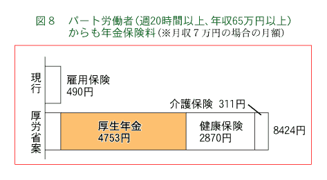さらにパート労働者なども週20時間・65万円あれば保険料を徴収するなど、無理やり「支え手を増やす」として、サラリーマンの妻(第3号被保険者)など400万人のパート労働者から、新たに保険料・税金などでの徴収強化をねらっています(図8)。