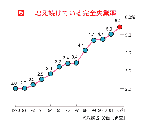 金融機関の「貸し渋り」「貸しはがし」による中小企業の倒産は、年間1万9000件にも達し、完全失業者は、この2年間で内閣発足前の2000年度に比べ、02年度は41万人も増加して360万人、完全失業率は5・4%(図1)となってしまいました。