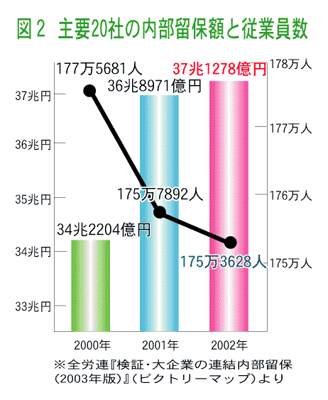 この2年半で、上場製造業だけで23万人も従業員を削減し、大企業はリストラ競争のもとで正社員を削減し、不安定雇用労働者を増加させています。主要大企業20社は、従業員を削減し、内部留保を増やしています(図2)。大学卒業生に占める就職者の割合は90年の81%から02年で57%に激減しました。