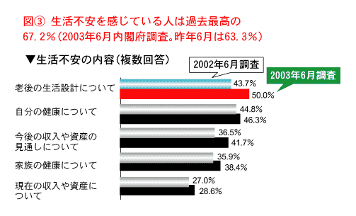 内閣府の「国民生活に関する世論調査」では、生活不安を感じている人は過去最高の67・2%に達しています。生活不安の内容では、「老後の生活設計について」や「収入や資産について」などの回答が多くなっています(図3)。
