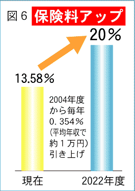 厚生年金の保険料は、今後20年間に現行13・58%(労使折半)を1・5倍の20%まで引き上げようとしています。しかも、毎年0・354%ずつ自動的に引き上げ、20%になってやっと固定し、不足すれば給付カットをするというものです(図6=「保険料固定方式」と言っています)。
