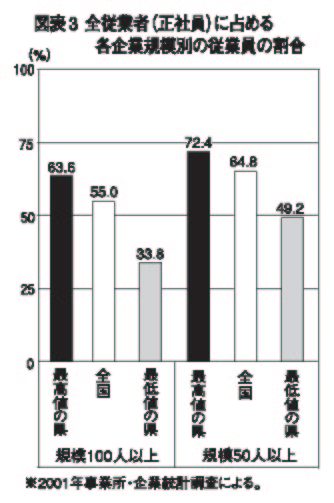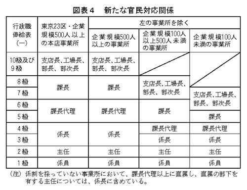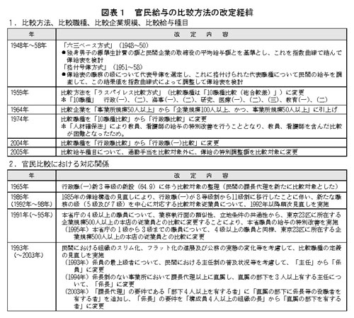 ●解説 人事院「代償措置」の役割を放棄政府・財界の圧力に屈し、拙速・一方的に変更比較企業規模見直し 3度にわたる閣議決定(昨年9月、12月、本年7月)など、政府の比較方法見直し圧力が強まる中で、人事院は比較方法の在り方に関する研究会と給与懇話会で検討を重ねる一方、今年の民間給与調査の対象企業を50人以上にまで先行的に拡大。研究会の最終報告がでると、組合との十分な話し合いもしないまま、短時日のうちに見直しを強行しました。 比較企業規模を引き下げ 今回の比較方法見直しで最大の問題は、比較企業規模を従来の100人以上から50人以上に引き下げたことです。政府の圧力や国会での論議、マスコミ論調などに屈したもので、中立第3者機関としての役割をみずから放棄するものです。しかも、従来方式であれば月例給で1・12%(4252円)、特別給で0・05月の改善が見送られたことになり、その不利益(年間51000円)は一方的に職員に押しつけられます。 比較規模を50人以上に拡大する理由として、人事院は「民間準拠の原則を今後とも維持しつつ、同種・同等の者同士の比較が必要」だとした上で、「国民の納得を得るためにはより広く民間給与実態の反映に努める必要がある」と説明しています。 100人規模以上では民間企業の従業者の過半数(55%)をカバーできるが、50人規模以上では6割以上(64・8%)となること、50人規模以上では最低の県でも従来の3割強(33・8%)から約5割(49・2%)に改善されること(図表3)、100人未満の企業においても公務と同様の役職段階(部長、課長、係長といった)がみられ、調査実施率も84%をこえ、調査実人員も十分確保できたことなどもあげています。 比較企業規模見直しの問題点 要するに、人事院の理由は「民間従業者のカバー率が増えることで、国民の理解が得られる」ということにすぎないことがわかります。これには、 ・ 職員が納得できる合理的な見直し理由が示されていないこと ・ 使用者政府の要請だけを考慮し、民間準拠の根幹部分を変更したこと ・ 公務の組織や業務実態、人事政策の共通性、新規採用市場における競合関係などからみてより適切な比較対象規模を検討しなかったこと ・ 企業規模100人以上との比較をほとんど唯一の労働条件決定の指標としてきた立場を自ら覆したこと などといった重大な問題点が指摘できます。 特別給比較でも規模を引き下げ 特別給(ボーナス)についても、人事院は月例給と同様、企業規模100人未満の企業を比較に加えることにふみきり、結果として公務の特別給は現行水準に据え置かれました。 特別給の官民比較は、事業所単位で前年冬と当年夏の支給額を調査の上、特別給の平均支給額を平均所定内給与月額で除して年間平均支給月数を求め、公務の年間支給月数と比較するやり方がとられています。 このような方法は、民間の特別給水準の迅速な反映の要請や調査上の制約によるもので、当面は現行方式を維持せざるをえないというのが、人事院の基本認識です。しかし、この現行方式のままでは、比較規模の見直しが特別給の官民較差に直接的に影響することから慎重な検討が求められていました。しかし、月例給との整合性のみを理由に、規模50人以上という機械的判断を下したという点は改めて人事院の姿勢が問われます。 役職対応関係も見直し 公務と民間企業という異なる集団間の賃金比較を正確に行うためには、職種(役職)、学歴、年齢など賃金を決定する要素をそろえて、同種・同格のもの同士の賃金を比較する手続きが必要になります(同種・同等比較)。 年齢や学歴はともかく、役職となるとそう簡単に同等性は判断できません。単に職名が同じでも職務の困難性や組織における責任の大きさが同じとは限らないからです。ライン職とスタッフ職の混在もあります。 そのため、これまでは、企業規模500人以上の民間企業の役職段階や構成員の大きさなどをみながら官民の対応関係を決定し、500人未満については、段階を下げた対応関係を決定しています。この官民の役職対応関係について、今回、(1)級編成の再編等に伴う対応関係の整理、(2)スタッフ職や部下数の満たない同等役職を比較に加える措置、(3)新たに100人未満企業の役職対応関係を定めることなどの大幅な見直しが行われました(新たな対応関係は図表4)。 注目されるのは、企業規模「100人未満」の課長以下の役職対応関係を「100人以上500人未満」のそれと横並びにしたことです。100人以上500人未満の対応関係は従来の「500人未満」の対応関係と実質的に変わりませんので、500人未満全体の課長以下との賃金比較に小規模事業所の賃金水準が反映していると考えられます。 勤続要素は無視 同種・同等比較を強調する以上、賃金を決定する要素としての「勤続年数」の重要性は否定できません。 人事院はこれまで、(1)「年齢」要素がある程度「勤続」要素の代替え要素になりうること、(2)勤続年数調査は民間企業の協力を得られにくい、(3)勤続を加えると比較の対