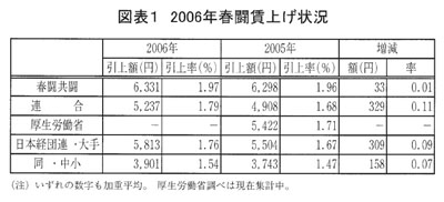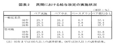 ●民間改善の中で公務は据え置き扶養手当(第3子等から)を改善給与改定 水準 人事院は、本年4月時点で官民較差が18円、0・00%と極めて小さく、俸給表改定は困難、諸手当も官民の状況が均衡しているとして月例給の水準改定は行わないことしました。 特別給についても官民の支給月数がおおむね均衡(民間支給実態4・43月分に相当)しているとして、年間4・45月の支給月数を据え置くこととする勧告を行いました。これらは、前述しているとおり、官民比較方法の「見直し」が大きく影響した結果です。 2年連続での「マイナス勧告」は避けられましたが、従来方式で勧告作業がすすめられれば大幅な賃金改善となっていました。国家公務員の利益擁護のための人事院勧告本来の役割を放棄し、公務員賃金を「引き下げる」ための勧告であることは言うまでもありません。 06年春闘が前年を上回る賃金改善の状況(表1)となったことをはじめとして、厚生労働省の「毎月勤労統計調査」4月確報値で、基本給に相当する所定内給与が前年同月比で0・6%増加し、2月から3ヶ月連続で増加していること、7月26日に出された中央最低賃金審議会の「目安」が2年連続で有額(2〜4円)の引き上げ答申となり、これを受けた地域別最賃では目安額に上乗せして改定する地域(東京・宮城など)が出始める状況にあることなど、社会全体が賃金改善方向にむかっています。 また、人事院が調査した民間における賃金改定(表2)の状況で、一般の従業員でベアを実施した事業所の割合が05年20・5%、06年25・7%(従来の100人以上でみると25・8%)と増加傾向にあること、定期昇給を行っている事業所の過半数の事業所において、昇給額が昨年より増額となっていることが明らかになっています。厳しい情勢を脱し、賃金改善をはかろうとしている民間の状況があらわれています。 こうした状況のもとで、人事院勧告が社会的に大きな影響を持つことをふまえれば、人事院が賃下げにつながる官民比較方法の「見直し」を強行し、「引き下げ勧告」を行ったことは重大な問題です。人事院は、賃下げを目的とする「見直し」ではないと言い続けてきましたが、従来の官民比較方法による結果と、「見直し」による結果の「較差」は、それが言い訳にしかすぎなかったことを示しています。 扶養手当 給与構造の「見直し」にかかわる原資(昇給の1号俸抑制分)を使って、扶養手当のうち第3子以降の子等にかかる手当額(現行5、000円)を第2子までの手当額(6、000円)に合わせる改善が行われます。給与構造の「見直し」とかかわることから、実施時期は07年4月からとなっています。 扶養手当の改善は、官民の均衡を図るものではなく、少子化対策などが国全体で推進する課題であるとの問題意識で、人事院が検討を進めてきたもので、子ごとの手当額のバランスに配慮したものです。 なお、この改善を検討する一方で、配偶者手当の引き下げがねらわれていました。この間の交渉で、配偶者手当を約5割の職員が受給しているという実態をふまえ、引き下げに反対したことに対して人事院は、配偶者にかかわる民間の支給状況が年々減少傾向にあると回答しています。来年以降について注視する必要があります。