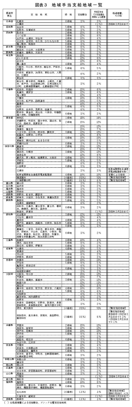 ●広域異動手当を来年度から実施へ「見直し」2年目の措置給与構造見直し 地域手当 地域手当は、昨年の勧告で、俸給表水準の引き下げ分(4・8%)と調整手当廃止の原資をもとに、地域の民間賃金水準を反映させる手当として新設されました。 支給割合は、改正給与法で1〜6級地別に定められています。段階的実施のため附則で読み替えが行われ、2010年3月31日までの間、暫定支給割合が定められます。 2007年度の暫定支給割合は、図表3のとおりです。