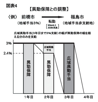 広域異動手当 広域異動手当は、人事異動にともなって、異動前後の官署間の距離及び異動前の住居から異動直後の官署までの距離が、いずれも60キロメートル以上となる職員に、異動の日から原則3年以内の期間支給されます。 手当額は、俸給、俸給の特別調整額及び扶養手当の月額の合計額に、異動前後の官署間の距離区分に応じた支給割合を乗じて算出されます。2段階に分けて導入されることから、支給割合は、2007年度は60キロメートル以上300キロメートル未満は2%、300キロメートル以上は4%、2008年度以降は60キロメートル以上300キロメートル未満は3%、300キロメートル以上は6%となります。 地域手当が支給される場合には、広域異動手当が地域手当の支給額を超える場合に限り、超える部分の広域異動手当が支給されます。特地勤務手当に準ずる手当が支給される場合には、特地勤務手当に準ずる手当の支給割合が2%減となります。調整手当の異動保障(図表4)や、研究員調整手当とも調整措置がとられます。 なお、この手当は諸手当(超過勤務手当、期末・勤勉手当等)の算定基礎になります。 また、異動前後の官署間の距離のみが60キロメートル以上となる職員などで支給対象職員との権衡上必要と認められる者についても支給されます。ワンタッチ異動(6か月以内の異動等)には支給されません。なお、再異動の取扱いについては別に定めるとし、施行日前に広域異動を行った職員に対し経過措置がとられます。