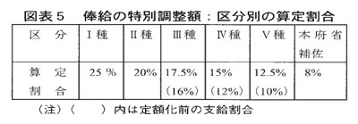 特別調整額の定額化 俸給の特別調整額(管理職手当)については、「年功的な給与処遇を改め、管理職員の職務・職責を端的に反映する」ことを目的に、2007年4月1日から定額制に移行します。 手当額は、「職務の級別の算定基礎号俸」(各職務の級の人員分布の中位(2006年4月1日現在)に当たる号俸)の俸給月額に「区分別の算定割合」を乗じて算定されます。算定割合のうち、地方機関の管理職に適用される3〜5種について、地方機関における超過勤務手当の支給実績を考慮して図表5のとおり見直され、引き上げた上で定額化されます。 なお、定額化に伴い減額となる職員については4年間の経過措置が設けられます。また、職務の級における最高号俸月額の100分の25を上限とすることとされています。