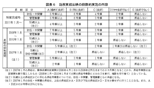 勤務実績の反映 昨年の人事院勧告で、勤務実績の給与への反映について、(1)査定昇給制度(図表6)の導入、(2)勤勉手当への実績反映の拡大、(3)昇格基準の見直し(昇給及び勤勉手当の勤務成績判定結果の活用)が行われました。 すでに、査定昇給については、管理職層の「判定基準」が示されています。勤勉手当については、「上位判定基準」は一般職員・特定幹部職員ともに共通ですが、「下位判定基準」は特定幹部職員の基準となっています。 今年の報告では、査定昇給制度及び勤勉手当制度における勤務成績の判定改善措置の活用について、2007年度からの一般職員への拡大に向けてこれまで示された基準をベースに準備をすすめるとしています。