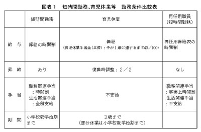 ●週所定時間短縮を継続検討育児のための短時間制度導入勤務時間 短時間勤務制度 人事院は、勧告と同日付で「育児のための短時間勤務制度」と「自己啓発等休業制度」を新たに導入する『意見の申出』を国会と内閣に行いました。なお、この「育児のための短時間勤務制度」については、介護とともに要求していた制度要求の実現ですが、「介護のための短時間勤務制度」については、介護休暇のあり方も含めて更に検討するとしました。 育児のための短時間勤務制度の導入 育児のための短時間勤務制度は、職員が育児休業などのように完全に職務を離れることなく育児を行えるようにするために設けられる制度で、職員に対する「育児短時間勤務職員」と、その後補充の「任期付短時間勤務職員」の2つで構成されています。 1 育児短時間勤務職員 育児短時間勤務を選択する職員は、「1日4時間(週20時間)勤務」、「1日5時間(週25時間)勤務」、「週2日半(20時間)勤務」、「週3日(24時間)勤務」の4パターンの中から、「1月以上1年以下」の単位で選択し、子が小学校就学始期に達するまで、期間の延長を請求することができます。 その間、俸給、地域手当、特別給は時間割した額が支給され、住宅手当など生活関連手当は全額支給されることが予定されています。昇給については、短時間勤務を選択したからといって不利には扱わないとしています。 なお、「週20時間勤務」を選択した職員が複数いた場合、2人で1つの官職を占めること(並立任用)ができ、その場合は、空いた常勤官職に常勤職員を当てることもできることになります。 育児のための短時間勤務制度の導入に伴い、育児休業期間の給与に関する復職時調整が1/2から2/2に変更されます。また、部分休業の名称を「育児時間(仮)」に変更し、対象となる子の年齢も「3歳」から小学校就学始期に改めるとしています。 なお、退職手当や共済組合、宿舎の取り扱いについては、育児休業との均衡等を考慮しつつ、検討が継続されています。 2 任期付短時間勤務職員 任期付短時間勤務職員は、短時間勤務職員が処理しない職務のために任用されるもので、原則、公募及び厳格な能力実証に基づき採用されます。 勤務時間は、週10時間〜20時間の範囲内で定められ、給与は、俸給表が適用され時間割した額が支給されます。手当については、職務関連手当は時間割した額が支給されますが、扶養手当、住居手当、単身赴任手当は支給しないとしています。 身分は、定員外の非常勤職員ということですが、以上のとおり、俸給表が適用され、一定の手当も支給されるなど、新たな概念の非常勤職員が誕生することになります。なお、任期付短時間勤務の官職には、60歳台前半の再任用職員の活用も想定されています。