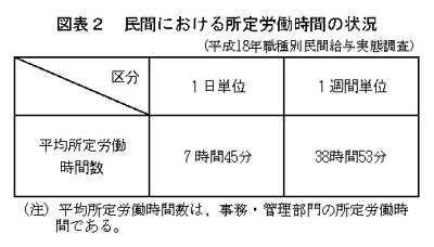 自己啓発等休業制度 自己啓発等休業制度は、職員の能力開発を促進していくためには、自発性を重視する必要があるとして、修学や国際貢献活動に参加する職員に休業を認めるというものです。1回につき3年を超えない期間で給与は無給です。 この休業制度について、当初、人事院は、公務貢献目的に限定しようとしていましたが、交渉等の結果、「職員の自発的な修学と国際貢献活動への参加」に認められる制度となりました。 なお、この制度が設けられることにより、職員の能力開発が個々の職員の責任とされ、組織としての責任である研修等がおろそかにならないように、組合として注意を払う必要があります。 所定労働時間 週所定労働時間については、超過勤務縮減問題への対応の「なお書き」で、「引き続き民間の動向把握を行うとともに、勤務時間の短縮が各府省の行政サービスに与える影響等についても調査を行うなど必要な検討を進める」と表現してるに止まっています。 人事院は本年、所定労働時間の調査を行っており、その結果、平均所定労働時間は、「1日単位:7時間45分」、「1週間単位:38時間53分」とのデータを明らかにしています(図表2)。 公務の場合は、「1日8時間、週40時間」であり、民間が公務を上回っていることが明らかです。にもにもかかわらず、これを改定しない理由を人事院は交渉の中で、「1日あたりでは7時間45分だが、1週間あたりでは39時間弱であり、38時間45分にはなっていないこと」、「これまでは、週休2日制での対処であったが、今後は、勤務時間の短縮であり、行政サービスに与える影響等も考慮しなければならない」等を挙げています。 給与が民間準拠というのであれば、勤務時間についても民間に準拠すべきで、データが出ている以上、早急に必要な措置をとるべきです。
