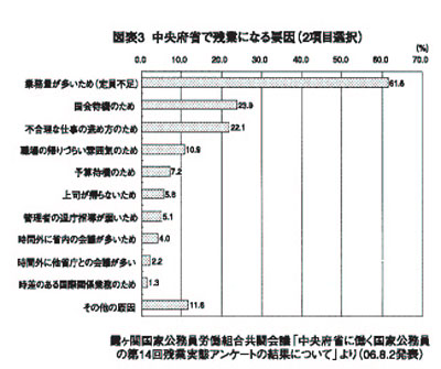 超勤縮減 超過勤務縮減問題への対応では、「政府全体として業務量を減らすとともに、現場における厳正な勤務時間管理や管理者・職員の意識改革が必要である」、「各府省において在庁時間及び勤務した時間等を適切に把握することが肝要」とした上で、人事院としては、「明確な超過勤務命令の要件、明示的な命令の徹底、他律的な業務における上限時間等を『超過勤務の縮減に関する指針』に盛り込む」としています。 国公労連は、超過勤務の縮減に関する要求で、勤務時間管理の徹底と不払い残業の根絶を要求してきました。 霞国公が、本年行った「中央省庁に働く国家公務員の残業実態アンケート」の調査結果では、月平均残業時間が38・9時間、残業手当の支給実態では「不払いがある」が71・1%に達しています。 こういう異常な現状から、人事院も、各府省に、職員の勤務した時間の適切な把握を求めるとともに、明確な超過勤務命令の要件等を「超過勤務縮減指針」に盛り込むことなどのとり組みを進めるといわざるを得なかったものといえます。 指針の発出だけでなく、その後の厳正な実施の確認を人事院に求めていくことと、各職場での実効あるとり組みが求められます。